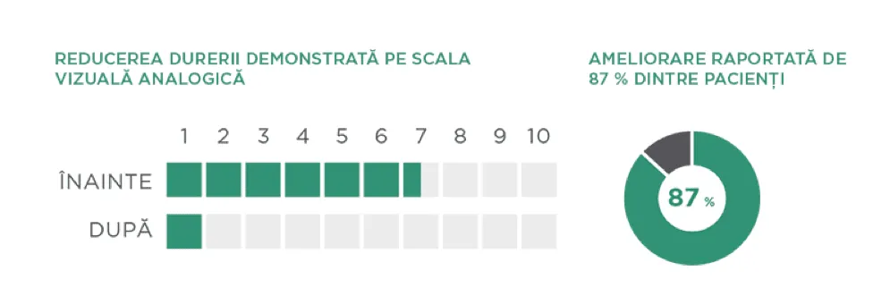 Graficele indică o reducere a durerii după 5 până la 10 terapii cu Sistemul Superinductiv BTL. Rezultatele sunt demonstrate pe Scala Vizuală Analogă. 87 % dintre participanți au raportat o scădere a durerii*