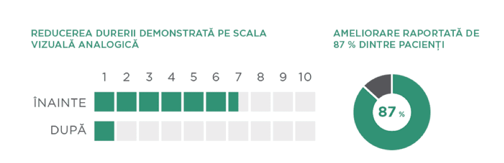 Graficele indică o reducere a durerii după 5 până la 10 terapii cu Sistemul Superinductiv BTL. Rezultatele sunt demonstrate pe Scala Vizuală Analogă. 87 % dintre participanți au raportat o scădere a durerii*